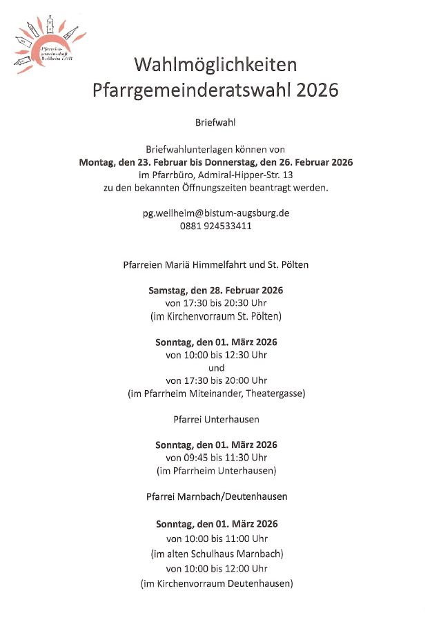 Sie können entweder per Briefwahl wählen oder persönlich in Wahllokalen in den Pfarreien Mariä Himmelfahrt, Sankt Pölten, Unterhausen und Marnbach/Deutenhausen. Alle Infos dazu entnehmen Sie bitte dem folgenden Dokument: